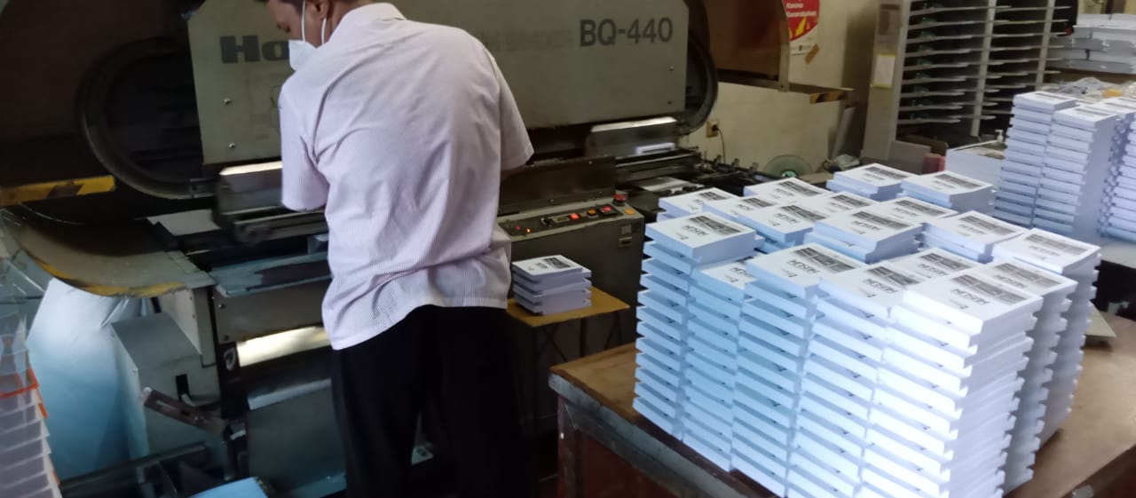 Cetak offset, digital printing, emboss, foil, laminasi, spot UV, Jilid spiral, bloklem panas dan lain-lain